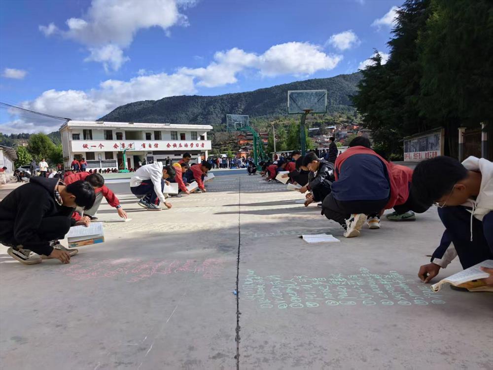 课间操时分,我们看到了更动人的一幕——学生们在操场上用粉笔默写,整个操场瞬间变成了一块五彩斑斓的黑板。而在这些埋头书写的孩子中,我们看见了学武认真的身影。